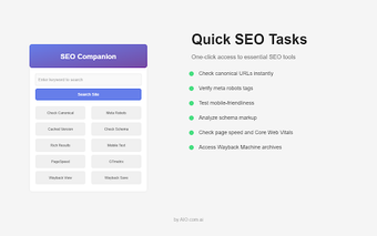 SEO Companion by AIO.com.ai 是一个强大的 Chrome 扩展,旨在直接从您的浏览器简化 SEO 任务。这个免费的工具提供了一系列功能,允许用户在不离开当前网页的情况下进行必要的检查。用户可以搜索关键词,检查规范 URL 和 meta robots 标签,并通过点击验证 schema 标记和丰富结果。此外,它提供有关移动友好性和页面速度的见解,使其成为快速 SEO 诊断的全面资源。